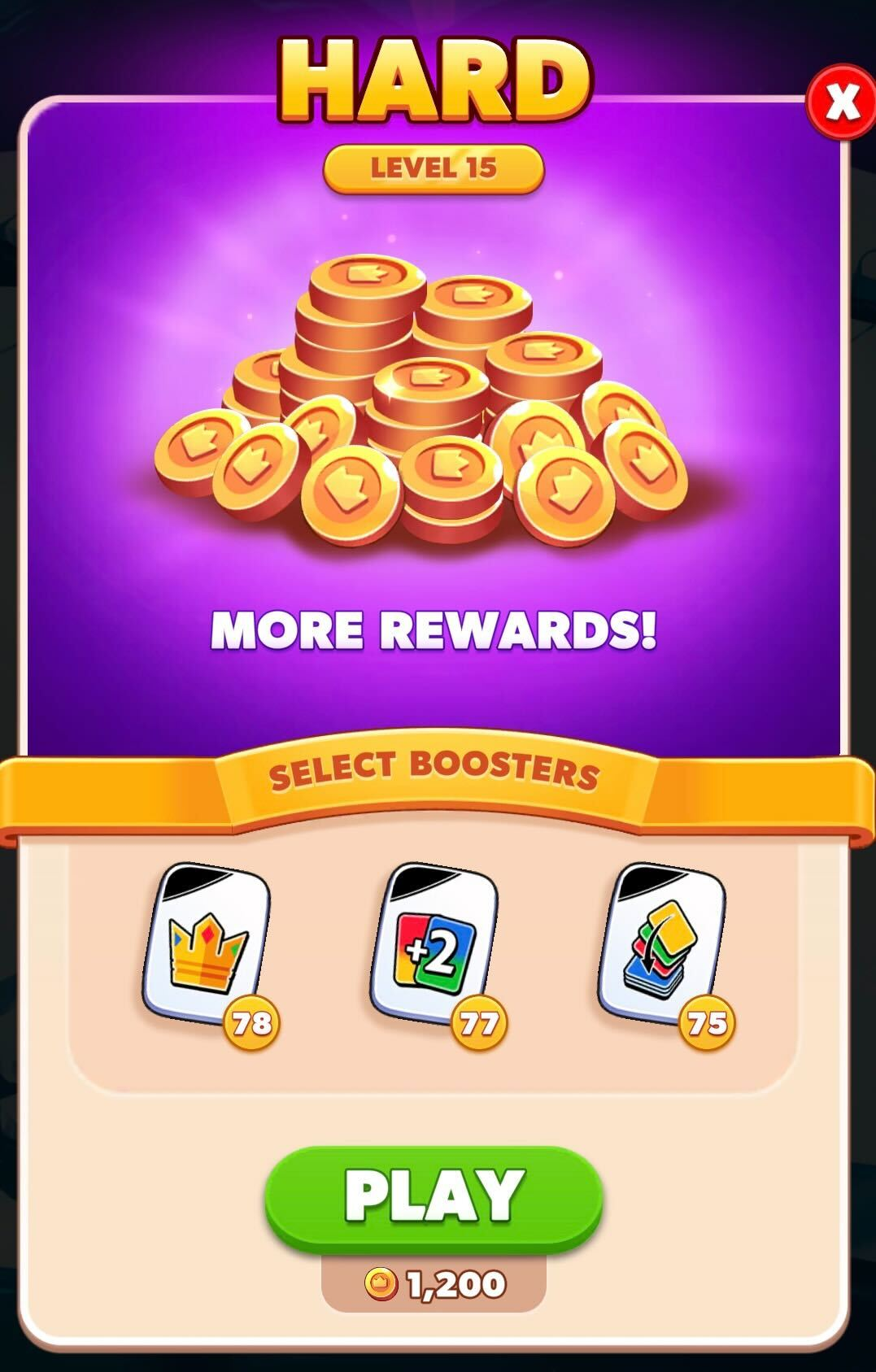Boosters are special cards that provide various advantages and enhancements in the game. Earn boosters by beating levels!